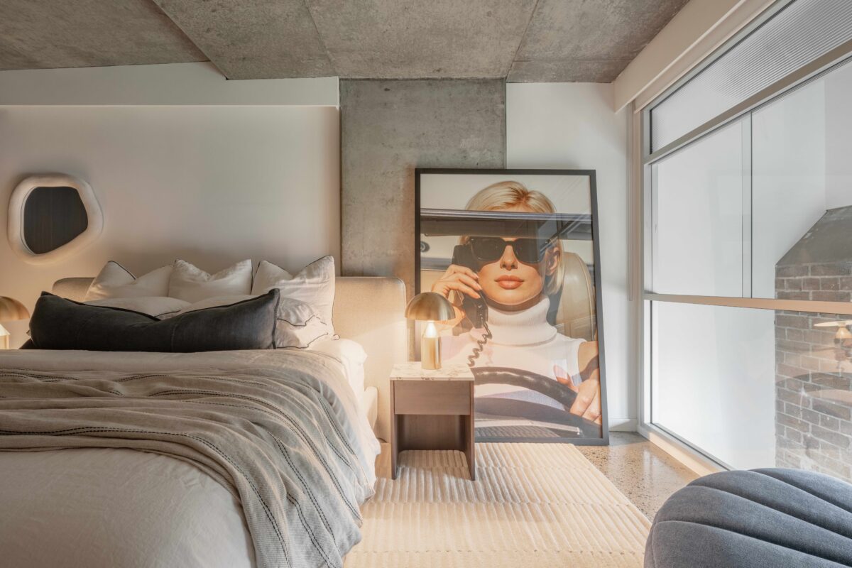 The master bedroom features a striking contemporary portrait that commands the space with quiet confidence, anchoring the bed against the raw concrete backdrop. The bedrooms don’t retreat from the warehouse narrative; they deepen it, proving that rawness and sanctuary can coexist. Each room becomes a study in restraint, breathing space, quality over quantity, and the confidence to let silence speak.