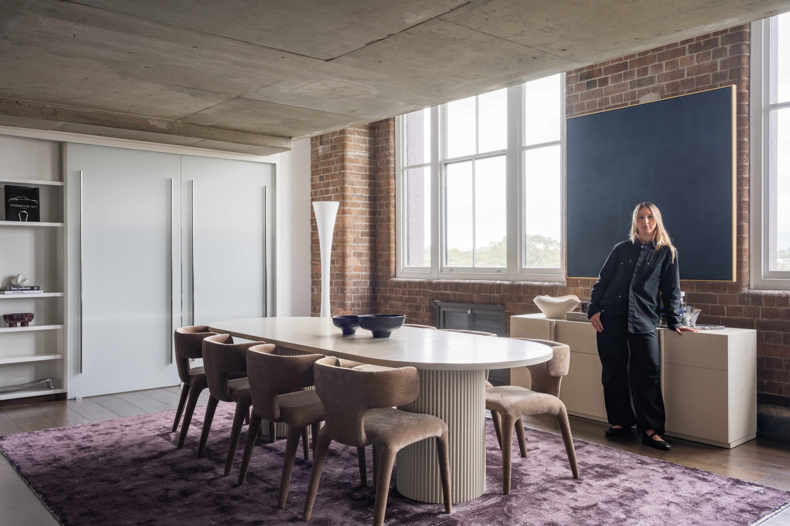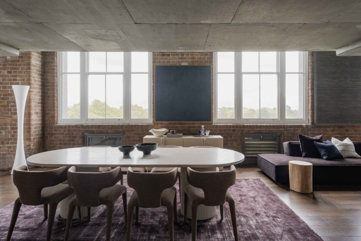 The dining space continues this narrative, a white oval table sits grounded beneath brick and beam, surrounded by considered seating that balances the vastness. It’s where the industrial backbone remains visible and celebrated, not hidden.