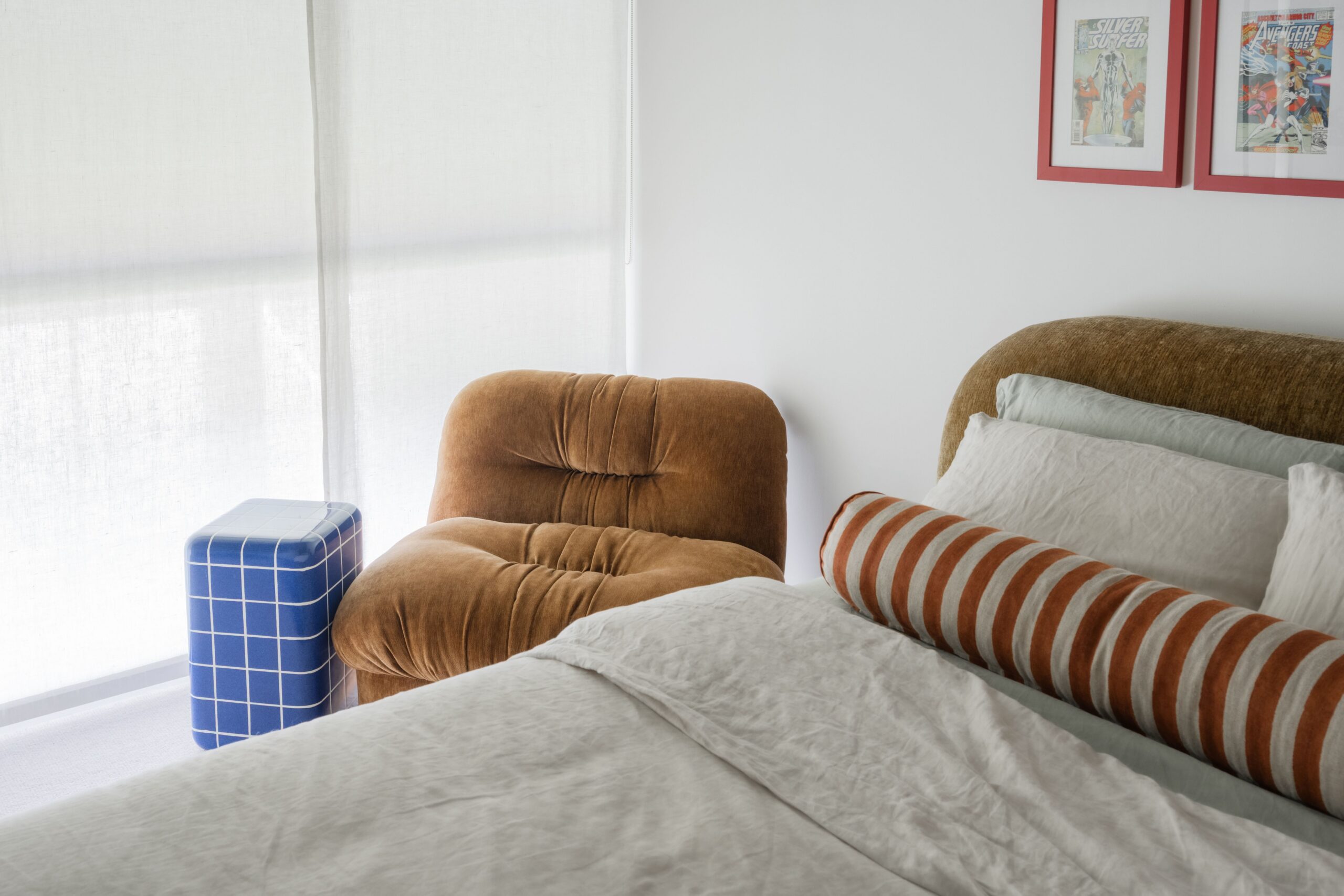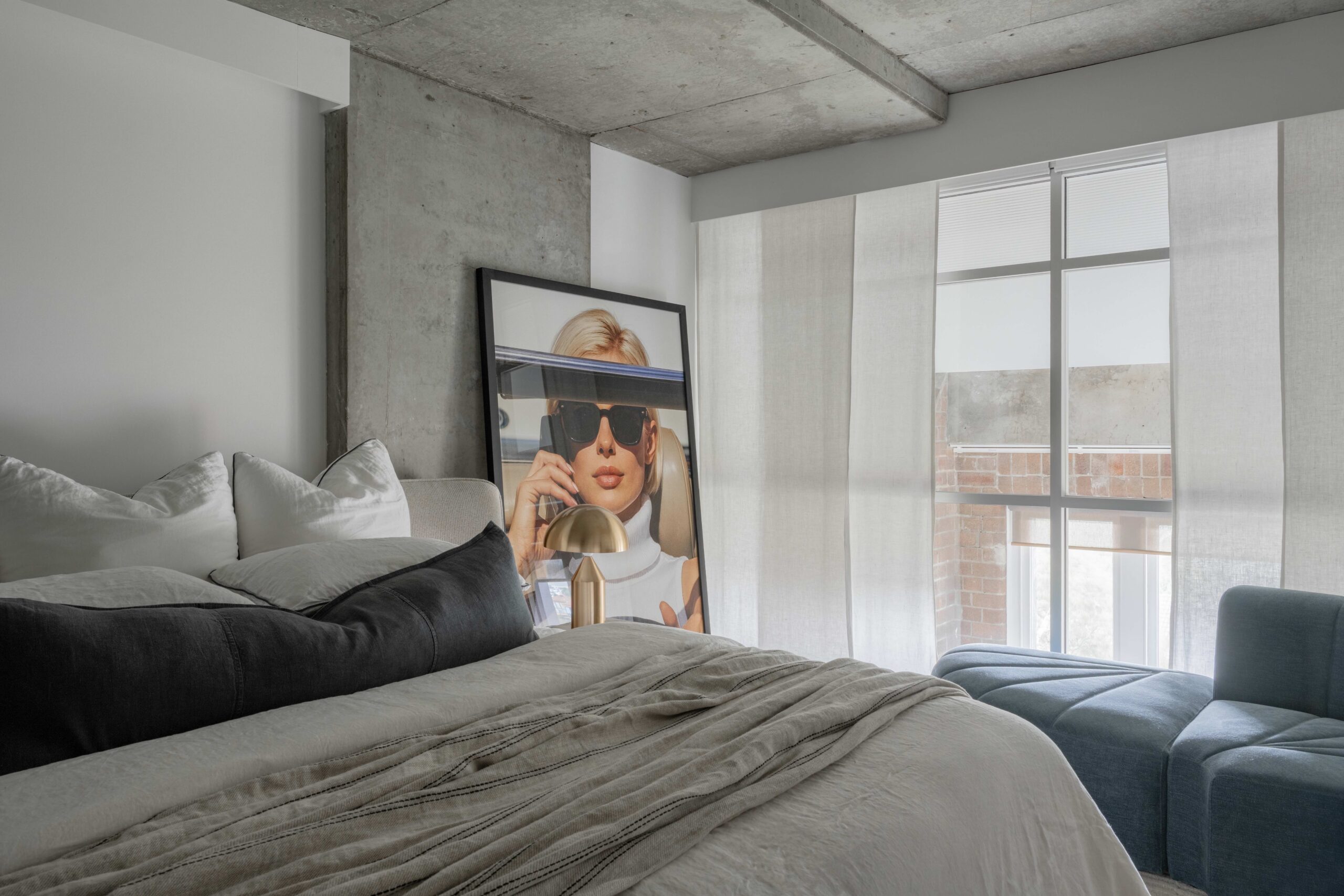 The bedroom zones proved equally compelling. Here, the warehouse language persists with intention: concrete ceilings, oversized windows, and structural elements frame the rooms. We introduced warmth through layered textiles, muted blues tones, and softer furnishings, yet the industrial soul remains present.