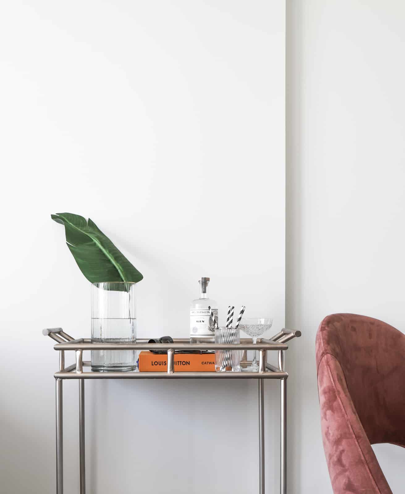 The dining area inspired by the LA’s iconic sunsets is where the apartment really comes to life, featuring dusty pink velvet chairs, which are balanced out by a white neutral palette. A chrome bar cart, detailed crystalware, and black and white palm print sit nearby and act as a nod to old Hollywood glamour.